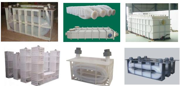 a)、產(chǎn)品選用美國杜邦公司PFA、FEP、PTFE細管材料制作,穿過多塊定位板,兩端與同材料接頭牢固焊接,盤繞成U型,W型,L型,直束型,圓形。用耐高溫耐腐蝕的PP純板或PVDF作保護框架內(nèi)能有效保護換熱器管束免受機械損傷,使之定型定位構成換熱器整體安裝與槽的長度。寬度或底部。