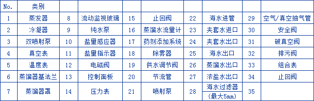 純凈的蒸餾水由凈水泵抽出,從冷凝器抽出的純凈水將由鹽量計(jì)檢測(cè),以確保達(dá)到預(yù)設(shè)的含鹽量要求(1-10ppm).如果含鹽量超過了預(yù)設(shè)的標(biāo)準(zhǔn),蒸餾水泵上的卸流管路的電磁閥將自動(dòng)激活開啟,不合格的蒸餾水將再次回供到噴射供水管.